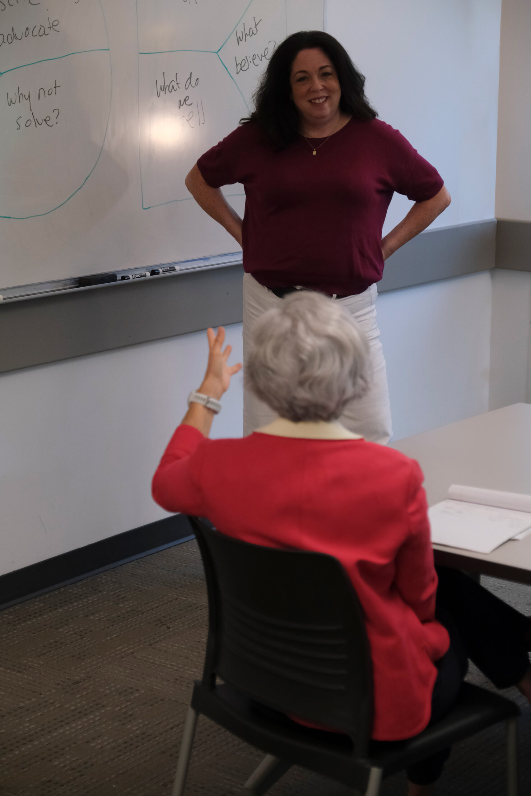 Jill and Margie talking in front of White Board 2